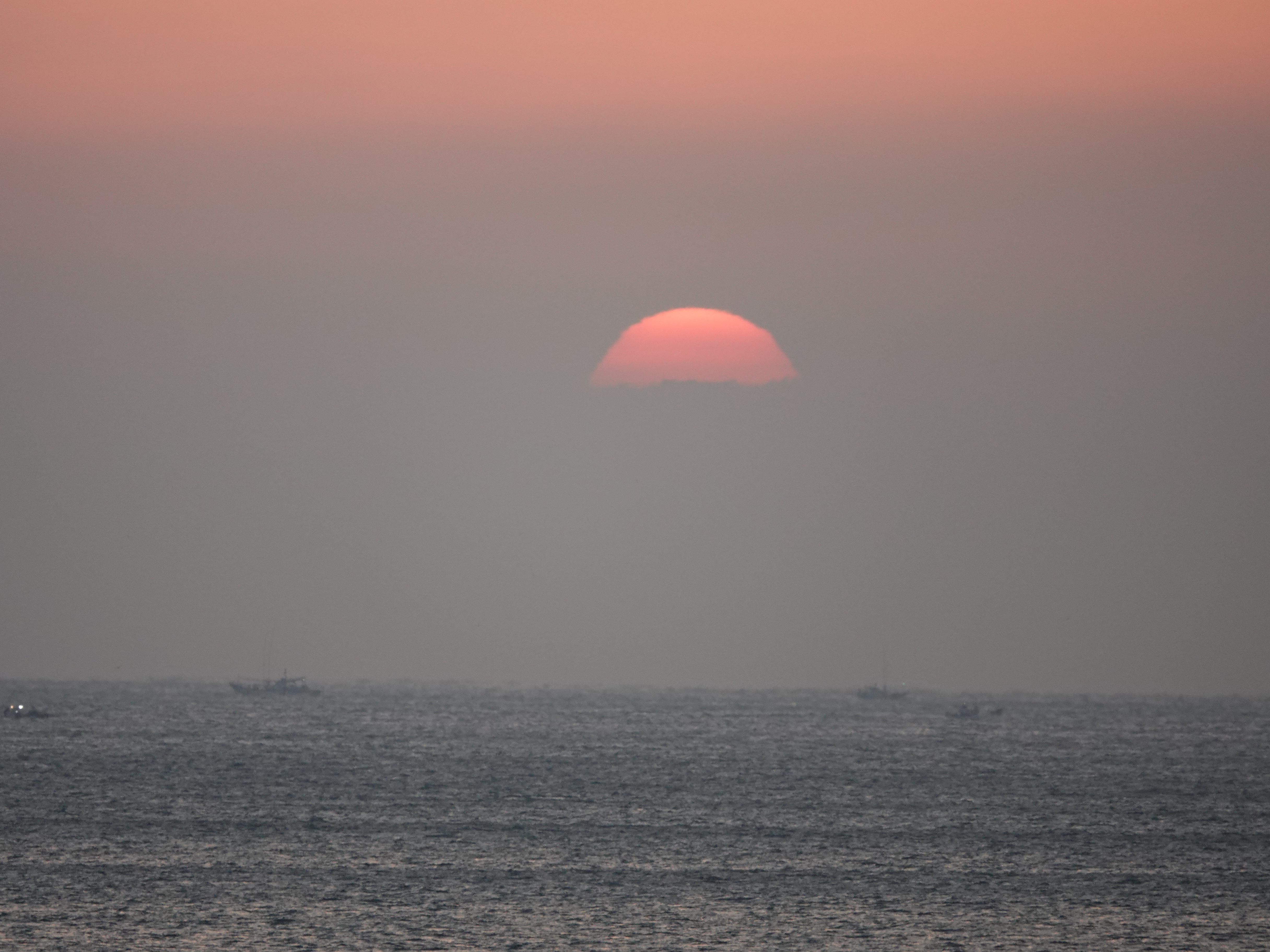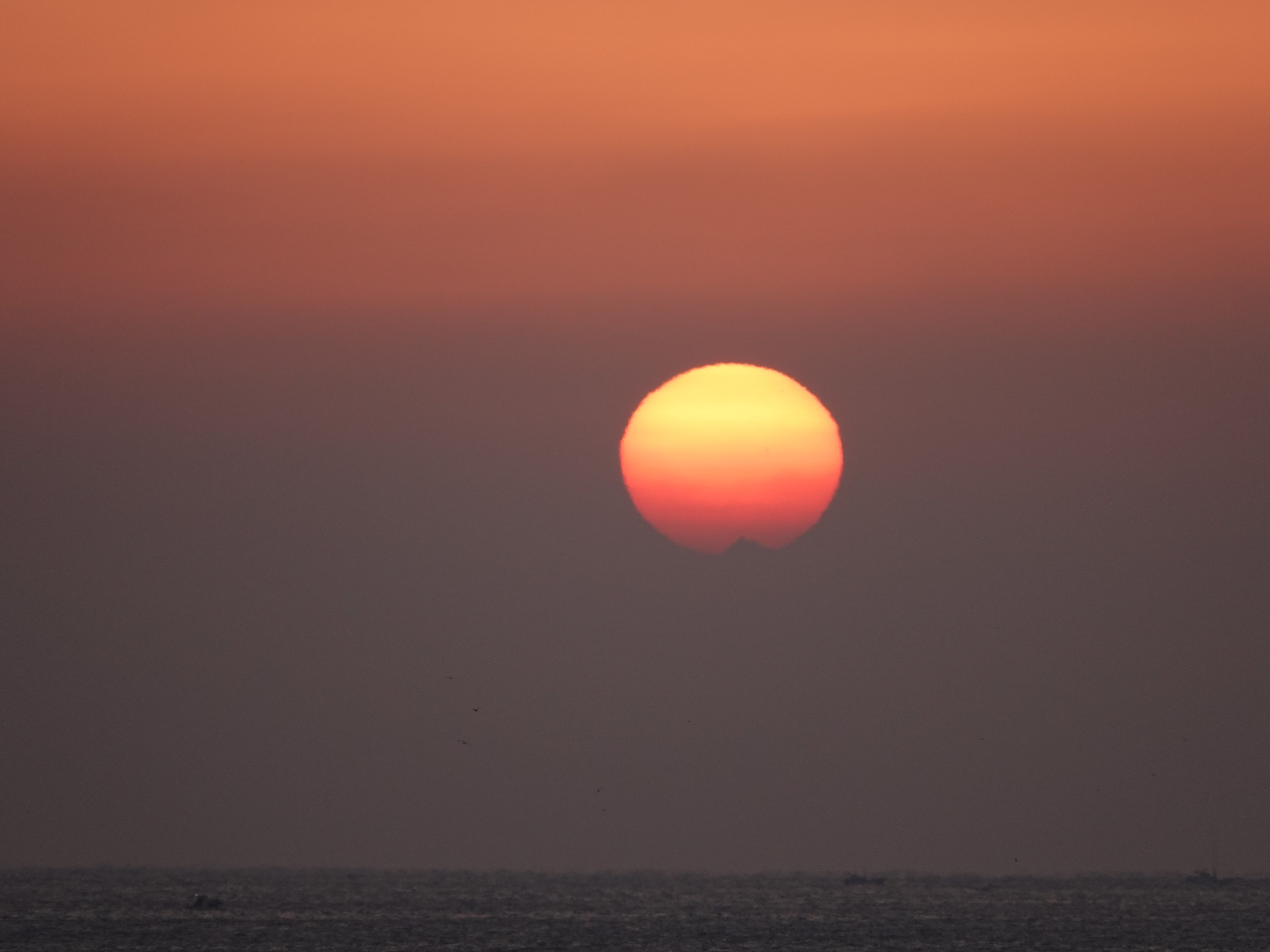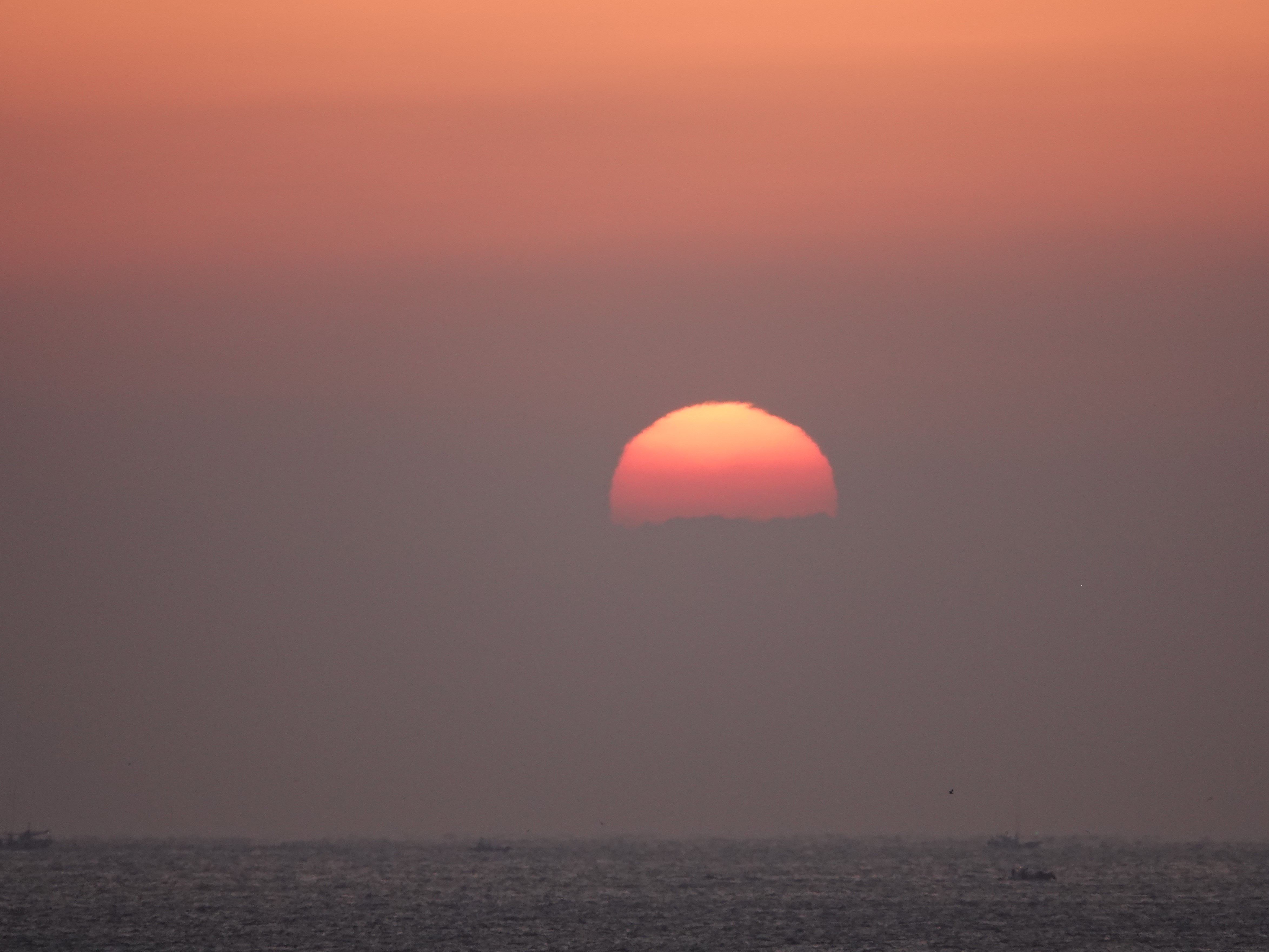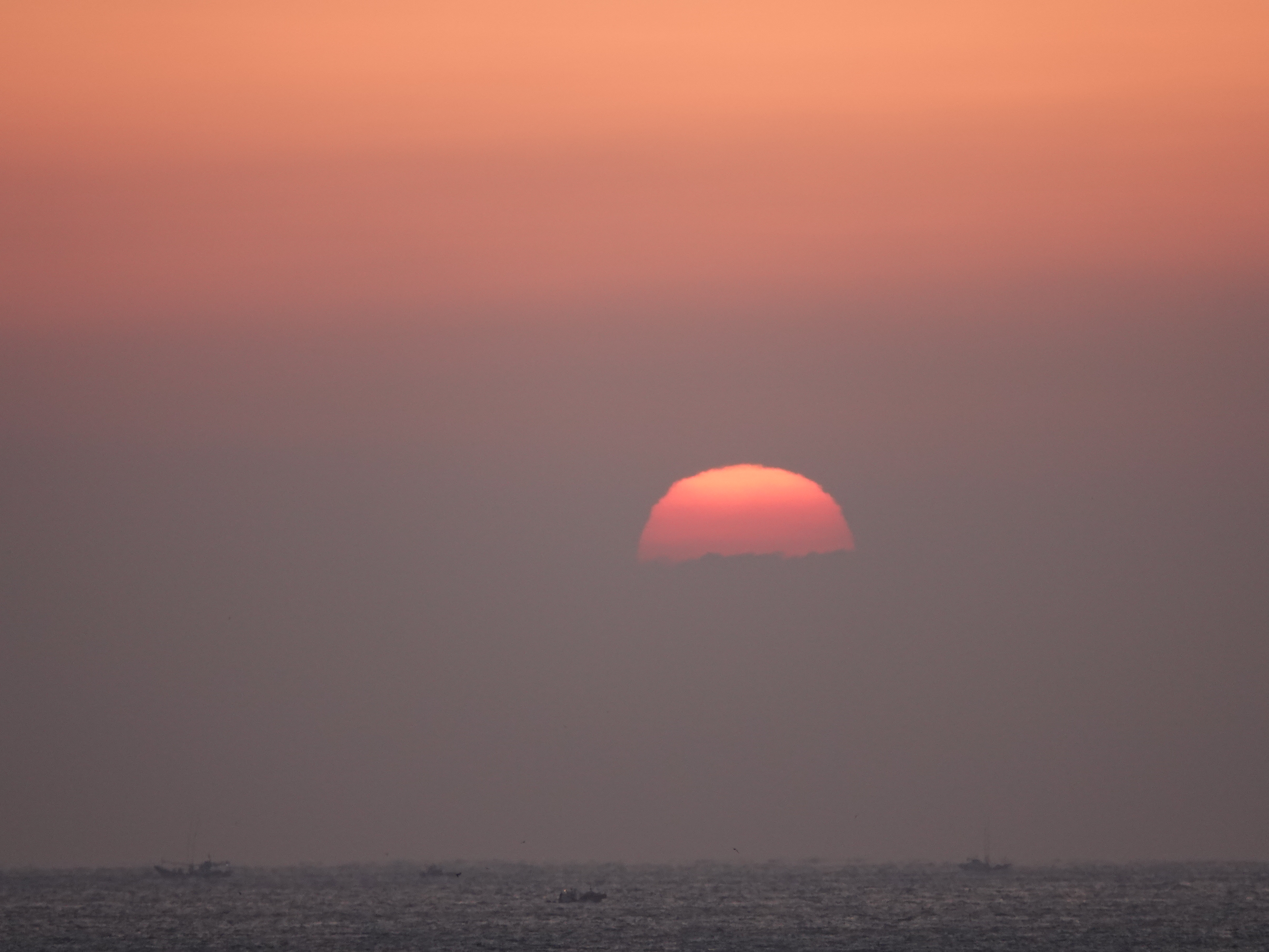 깨스층과 미세먼지가 많아 깨스층 중간에서 힘차게 차오르는 해는 붉은색을 띠고 올라 옵니다