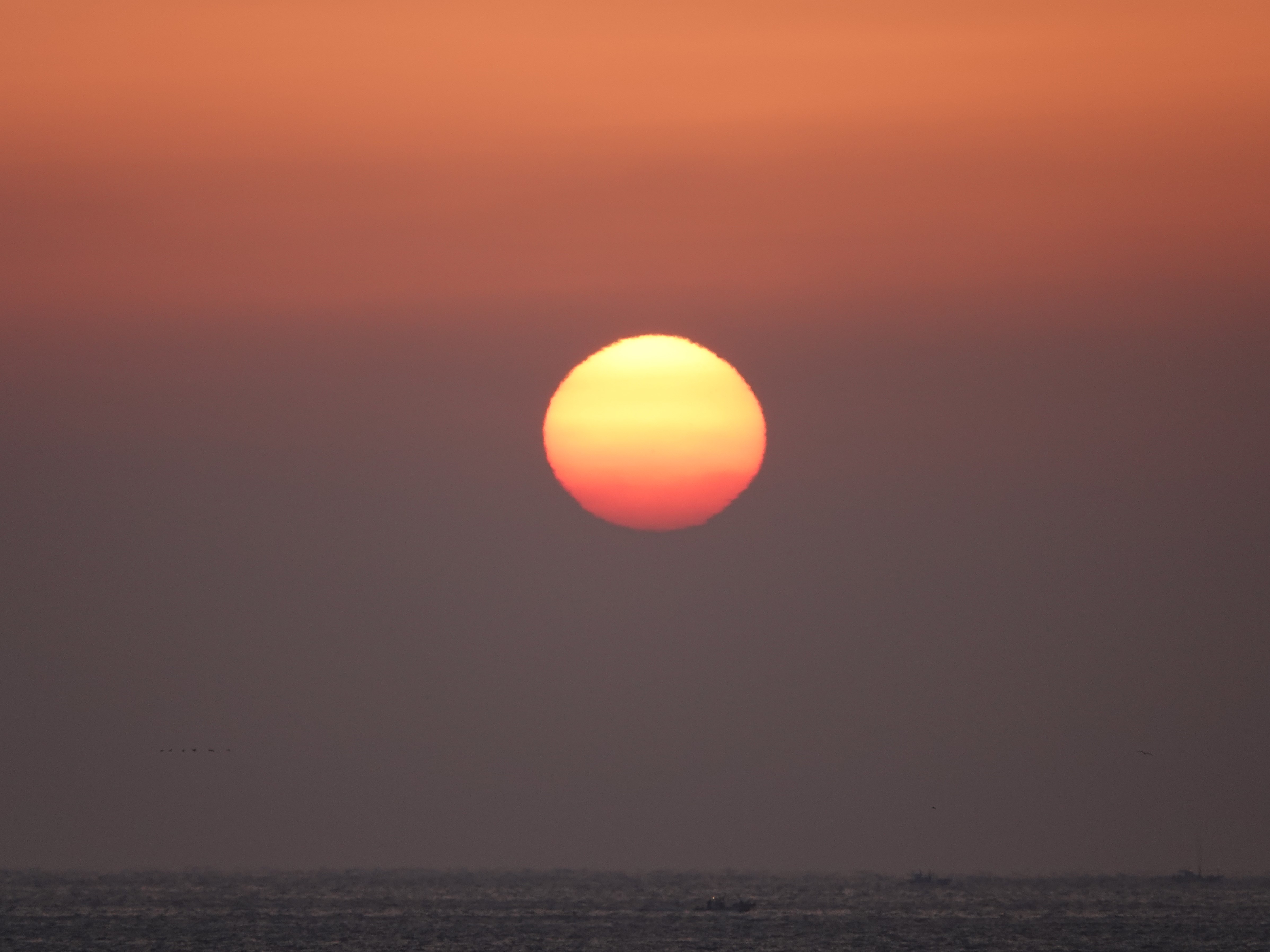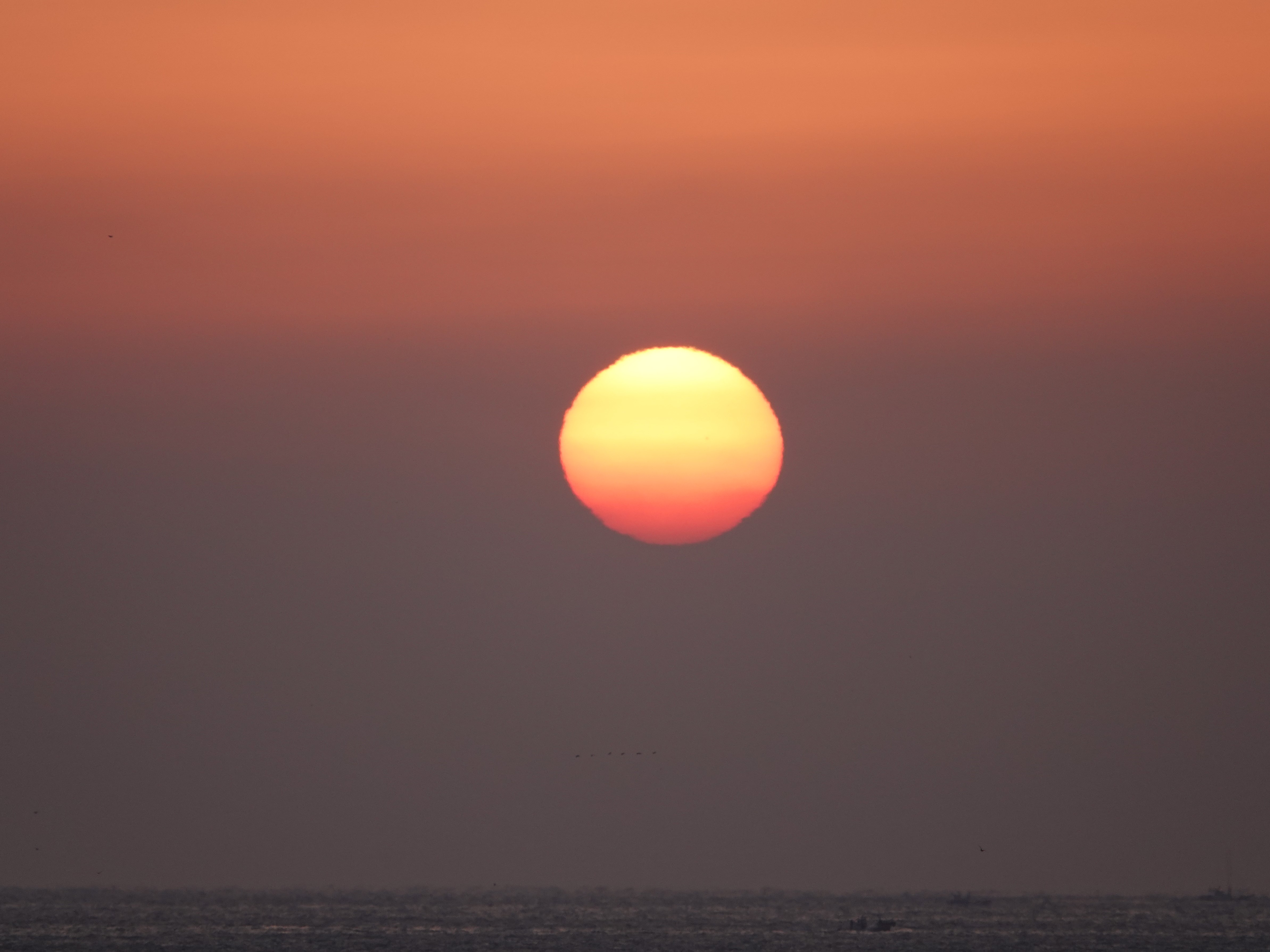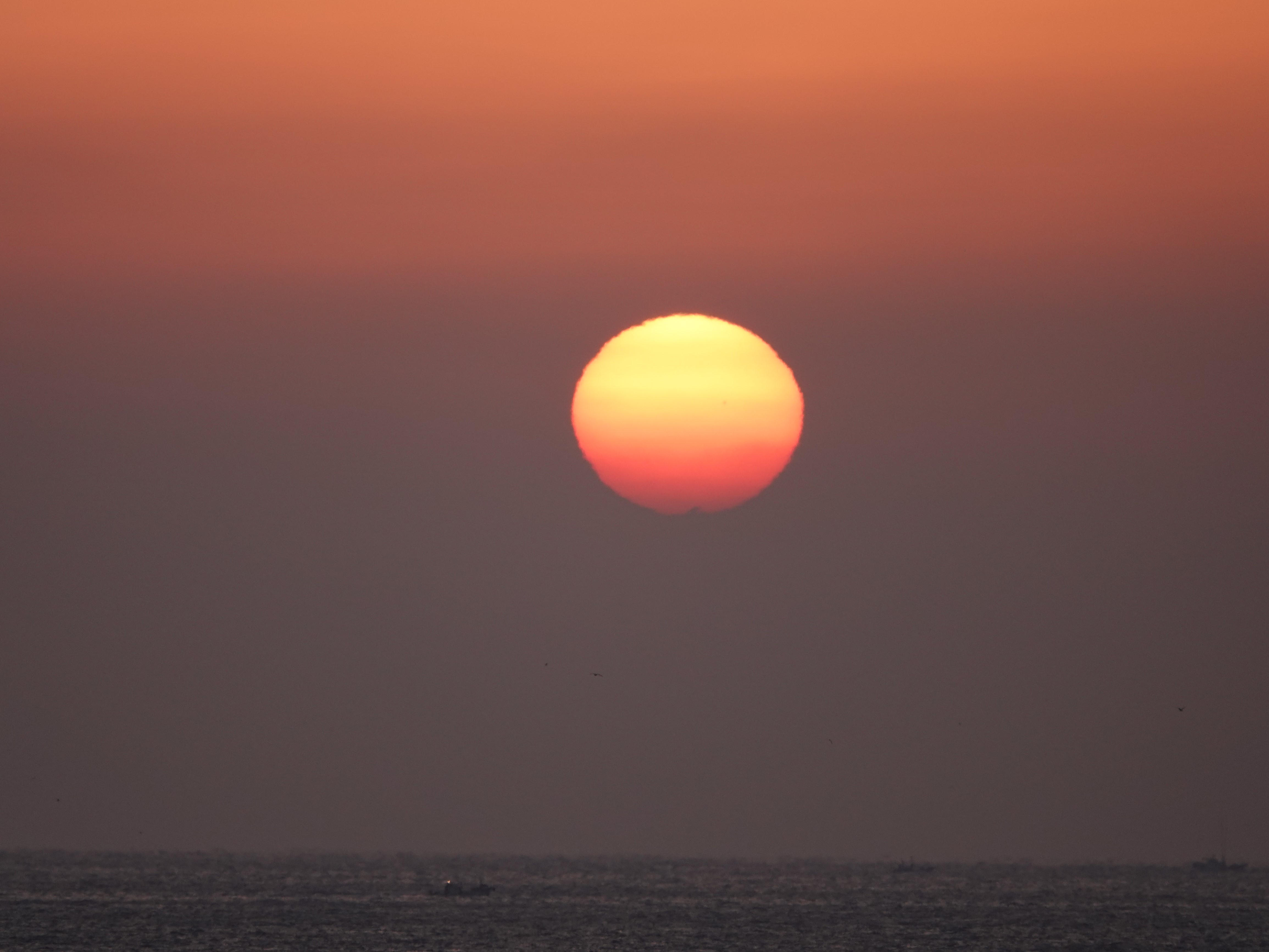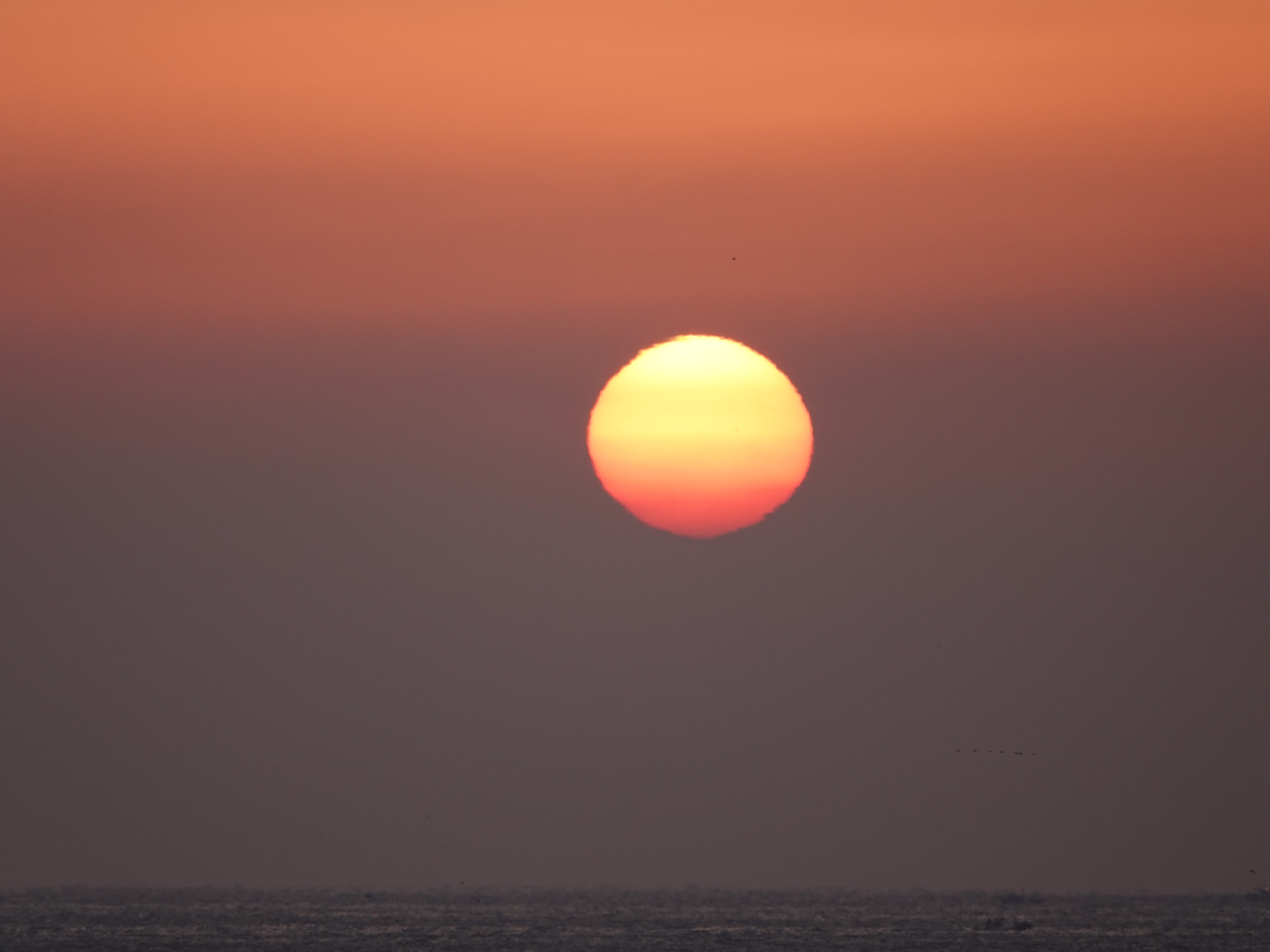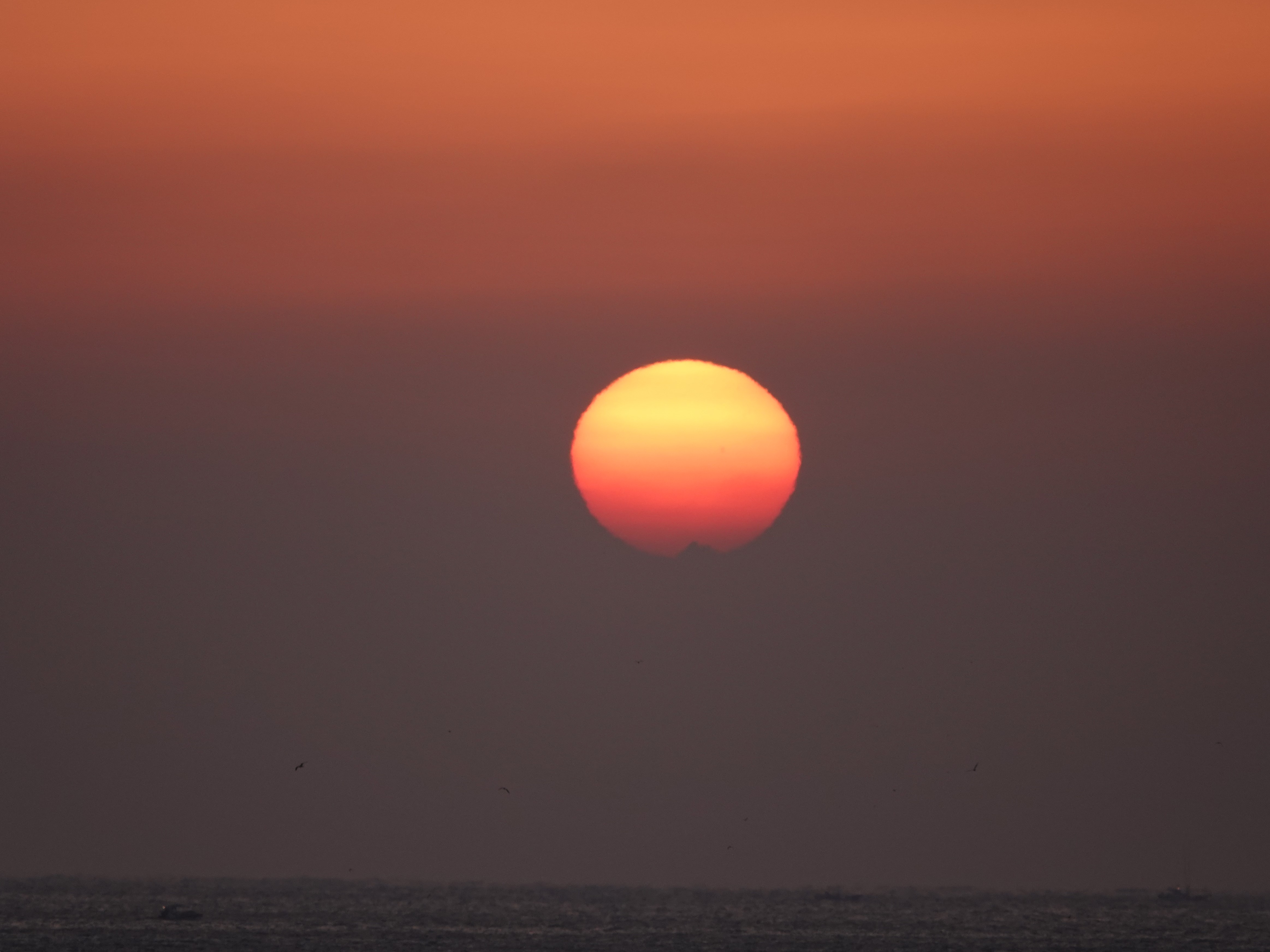 깨스층과 미세먼지가 많아 깨스층 중간에서 힘차게 차오르는 해는 붉은색을 띠고 올라 옵니다